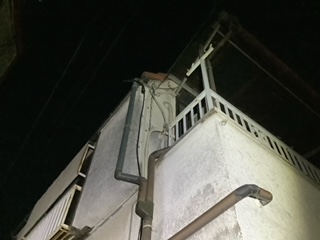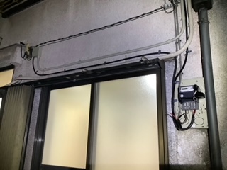 日が短く、引込口配線工事が終わる頃には暗くなってしまいましたので、見えにくくなりましたが、ベランダから手の届かない位置に単相3線の電線を張り上げました。